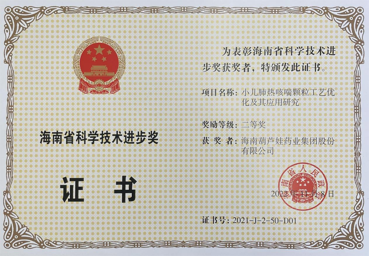 为此,小儿肺热咳喘颗粒的制备方法获得了第二十一届中国专利优秀奖(2019年),专利申请号:ZL201010134951,此次作为专利技术的应用,获得了2021年度海南省科学技术进步奖二等奖。在此之前,J9游会牌小儿肺热咳喘颗粒还多次被授予“临床价值中成药品牌”、“中国连锁药店最具合作价值单品”,荣登“中国医药品牌榜”。