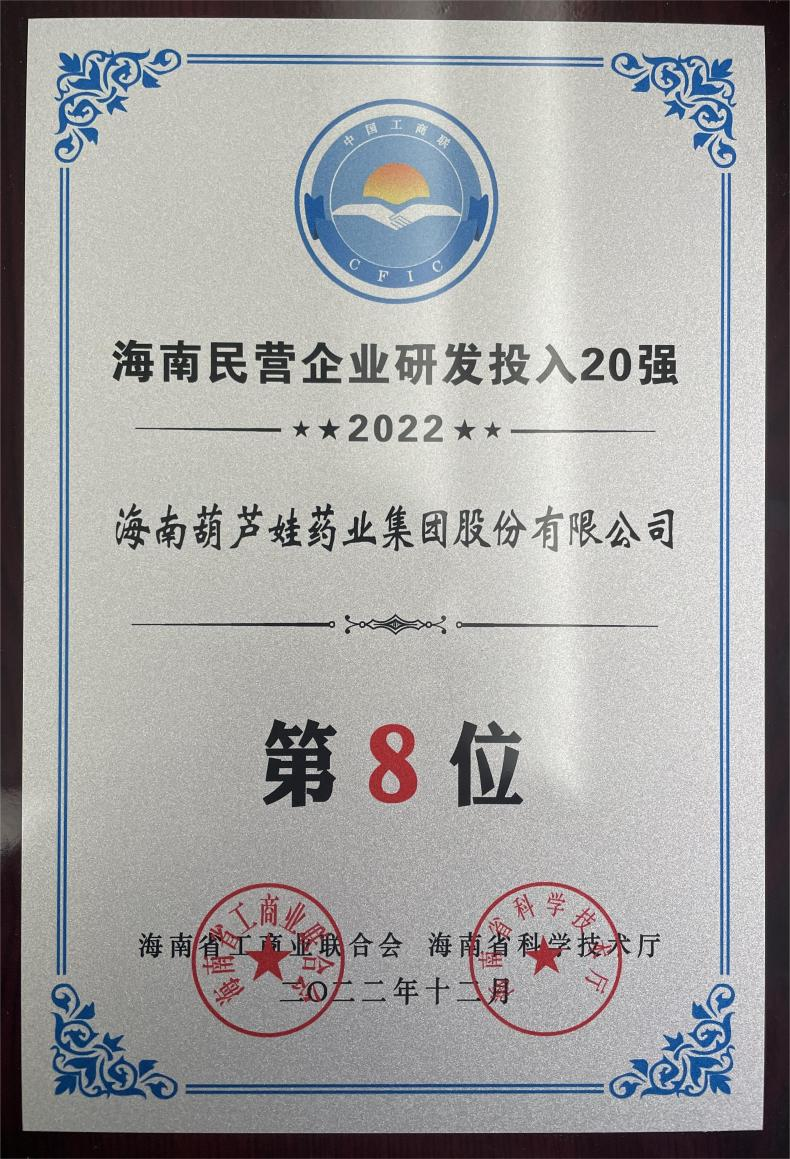 12月23日,2022海南民营企业50强和研发投入20强发布会在海口举行。会上发布了“2022海南民营企业50强”“2022海南民营企业研发投入20强”榜单和分析报告。J9游会药业再次荣登两榜,在海南民营企业50强榜单中位列第25位,较去年上升8位,这也是公司连续三年登榜;在海南民营企业研发投入20强中位列第8位,较去年上升7位。